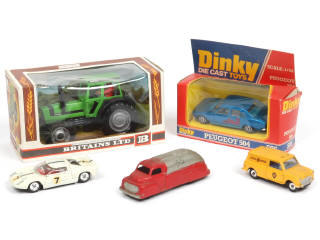 comprend notamment les modèles : DEUTZ, MINI (manque pannonceau de toit), FORD & PEUGEOT - on y retrouve les marques : DINKY TOYS (FRANCE & GB), BRITAINS & TOOTSIETOY - 2 boites en état 'b' (petit accroc sur le blister)