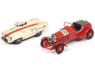créations artisanales en bois - comprend : PEGASO 102 B2 1953 & ALFA ROMEO 2300 1932 (un saute vent à refixer)