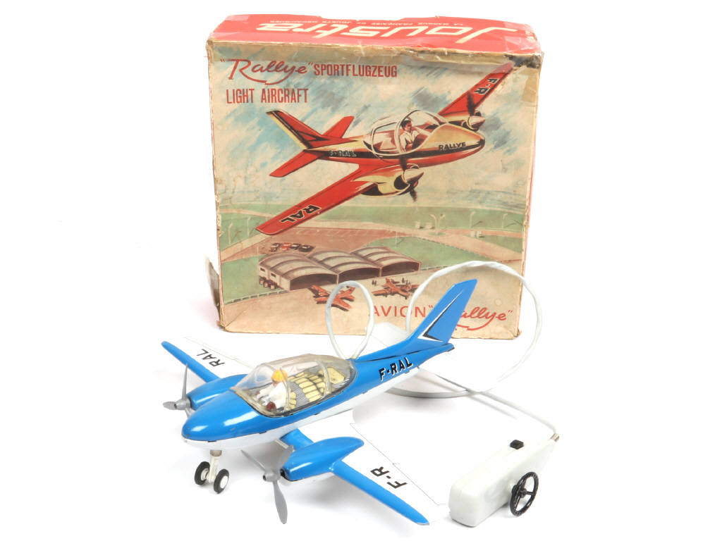 envergure 37 cm - moteur à piles (à revoir - oxydation dans le compartiment) - légères traces d'oxydation par endroits - ruban adhésif sur l'ensemble de la boite
