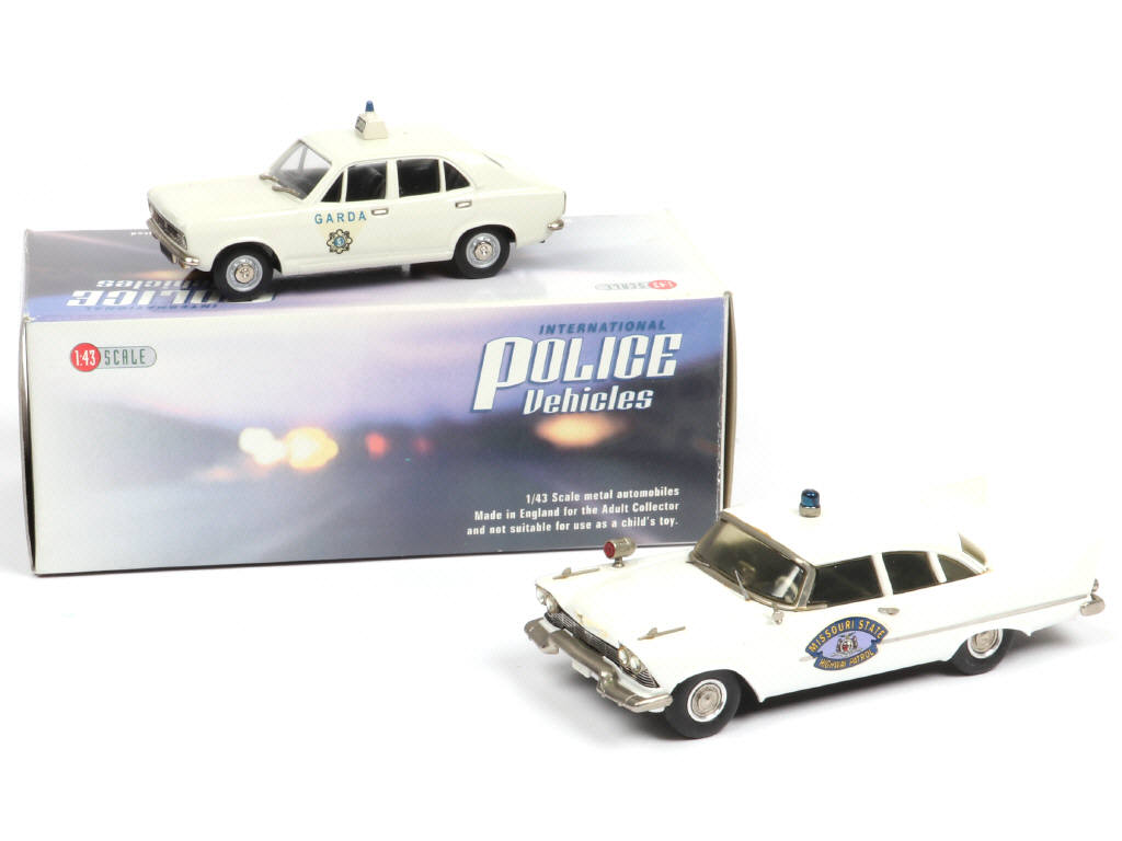 comprend : HILLMAN AVENGER 'GARDA' 1971 (manque antenne) & PLYMOUTH 'MISOURI STATE' 1958 (légère déformation d'un essuie-glaces) - on y retrouve les marques : INTERNATIONAL POLICE VEHICLES (boite en état 'a') & WESTERN MODELS