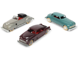 comprend : MATFORD MILORD Cabriolet (capote repeinte, petites traces de métal fatigue sur les banquettes, une extrémité de pare-chocs arrière cassée & recollée), CHEVROLET Coupé (peinture craquelée avec traces de métal fatigue) & coupé - pneus séchés & jaunis (certains affaissés)