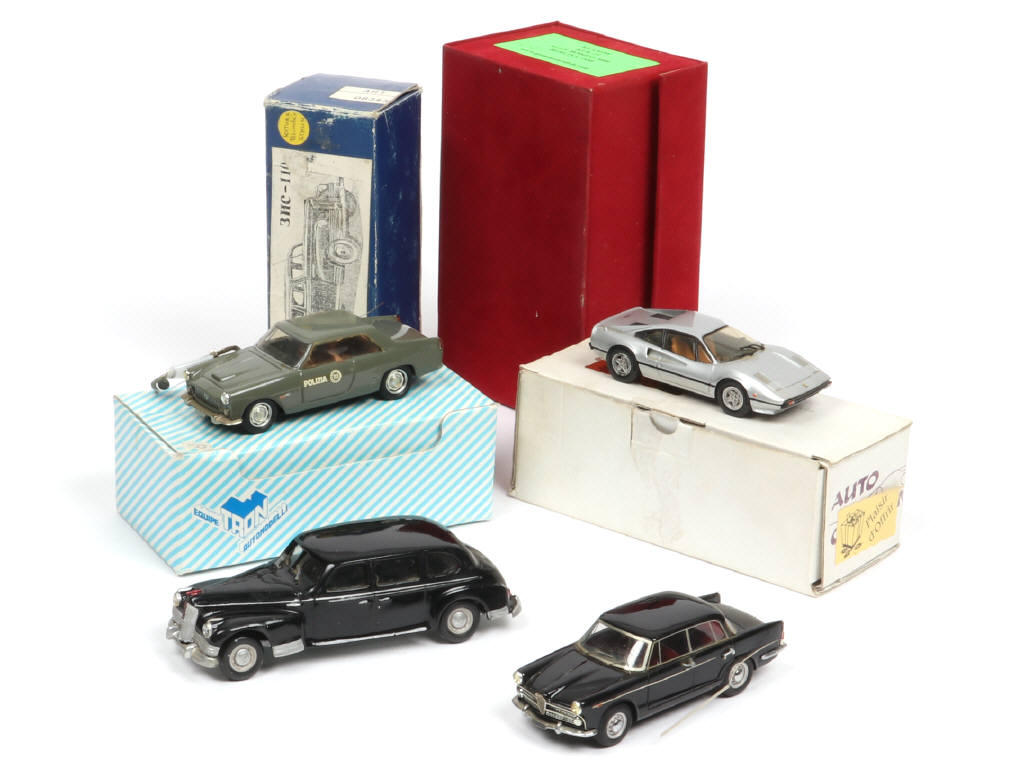 comprend : ALFA ROMEO 2000 BERLINA 1958, FERRARI 308, LANCIA FLAMINIA 'POLIZEI' & ZIS 110 (voiture blindée de STALINE) - on y retrouve notamment les marques : RECORD, GAMMA MODELS & TRON - avec manques & parties cassées à recoller - quelques petites traces de colle par endroits