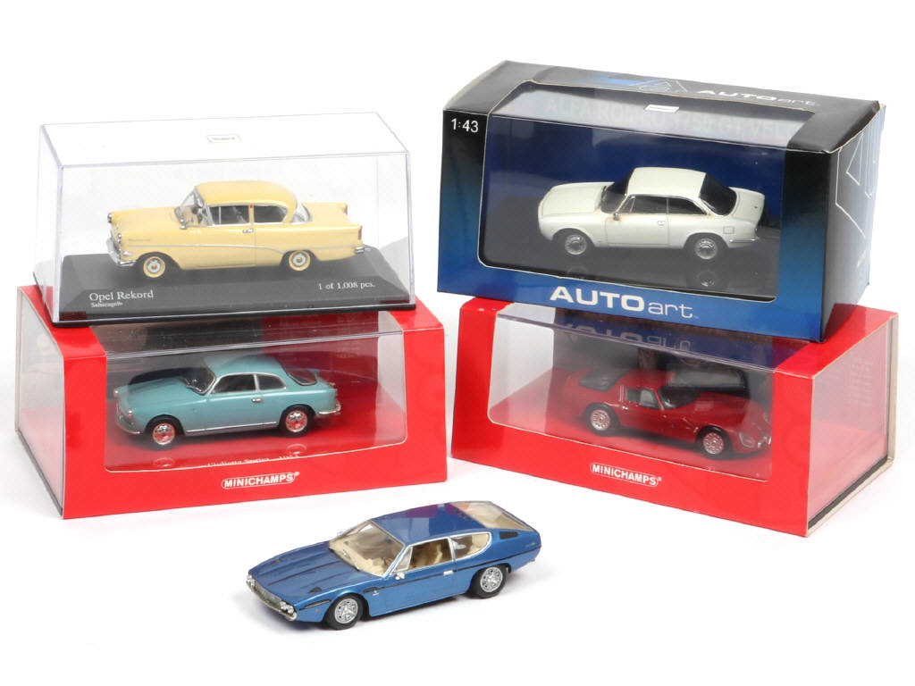 comprend : OPEL REKORD (manque un essuie-glaces), ALFA ROMEO GIULIETTA 1954, GIULIA TZ 1965, 1750 GT VELOCE & LAMBORGHINI ESPADA (sans boite) - on y retrouve les marques : AUTOART & MINICHAMPS