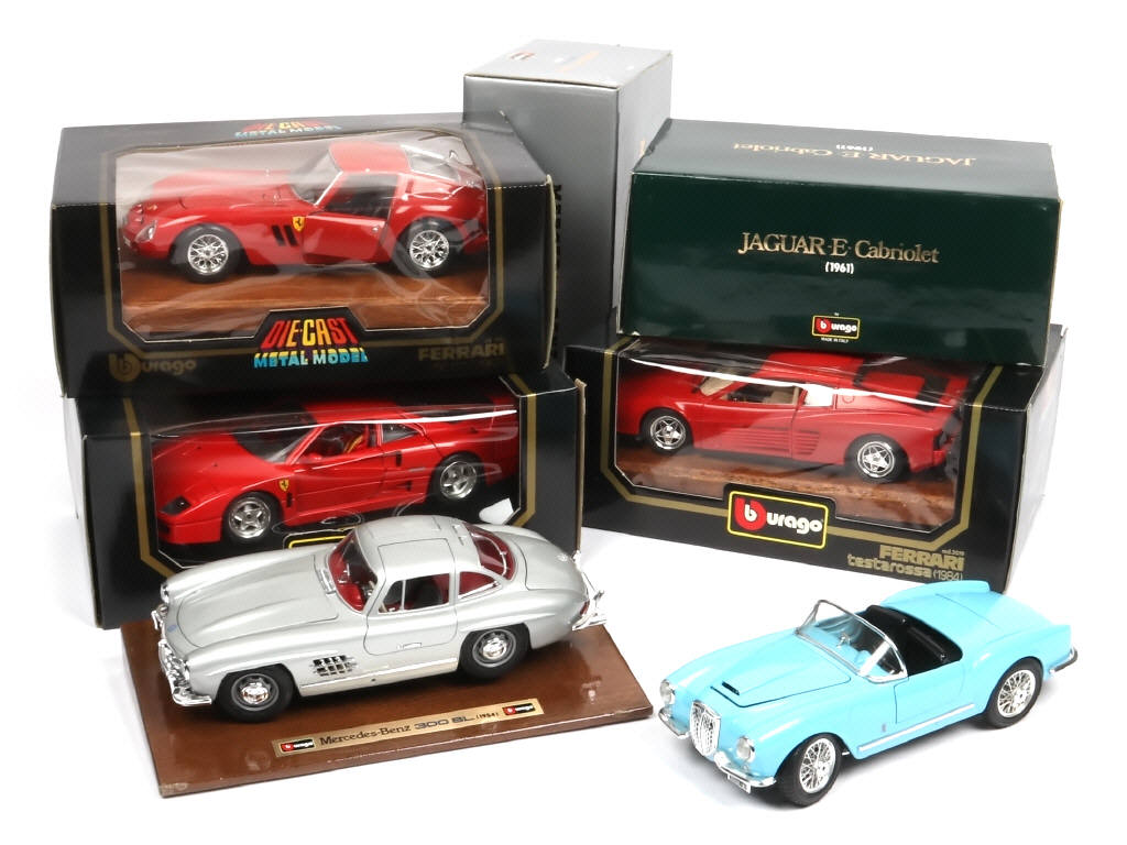 comprend les modèles : MERCEDES, FERRARI, LANCIA & JAGUAR - 4 modèles sur socle en bois & un sans boite