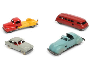 série démontable (non motorisée) - comprend : camion-plateau PERCHE-MAINE (métal fatigue avec petits manques), autocar de voyages (très légères traces de métal fatigue sur le châssis, pneus séchés), cabriolet décapotable (quelques salissures sur la carrosserie par endroits, petites traces de métal fatigue avec un manque de peinture sur la capote) & KAISER HENRY (métal fatigue à l'avant du modèle) - quelques déformations & pneus endommagés