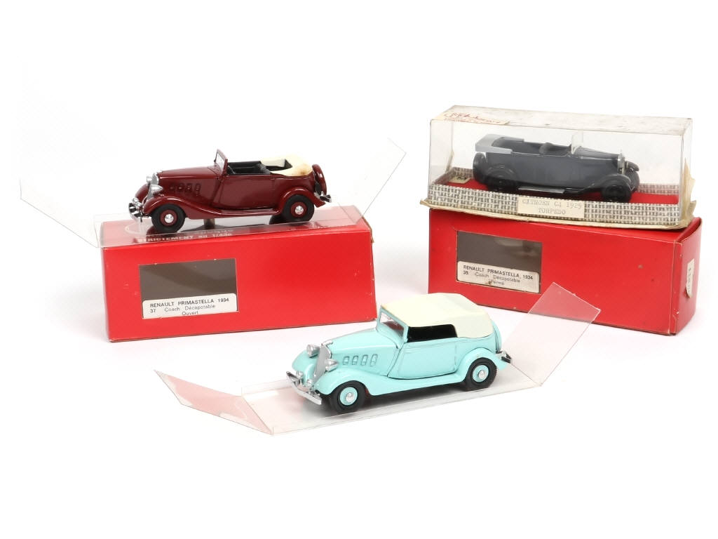 comprend : CITROEN C4 1929, RENAULT PRIMASTELLA coach fermé (plaque minéralogique à repositionner) & ouvert (une petite trace d'humidité sur un bord de capote) - boites légèrement encrassées dont 2 avec parties en plastique bloquées à l'intérieur de leur suremballage cartonné