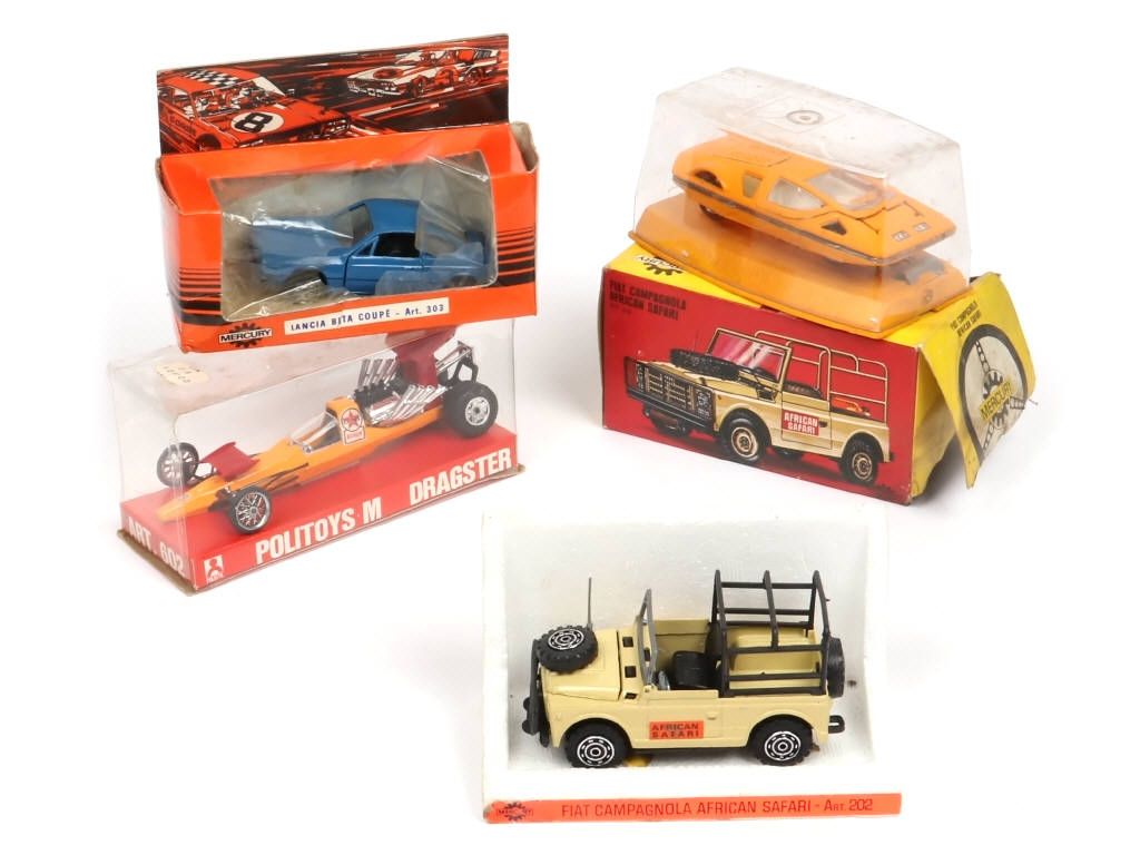 comprend : FERRARI 512 S MODULO, LANCIA BETA coupé (traces d'humidité - blister de boite déchiré), DRAGTER & FIAT CAMPAGNOLA - on y retrouve les marques : POLITOYS & MERCURY - boites en états 'b' à 'e'