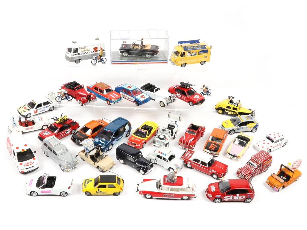 série LE TOUR DE FRANCE - comprend notamment les modèles : LA VACHE QUI RIT , L'ÉQUIPE, FRANCE INTER, EUROPE 1 & AQUAREL - on y joint 3 cyclistes - un modèle en boîte - possibilité de petits manques & parties cassées