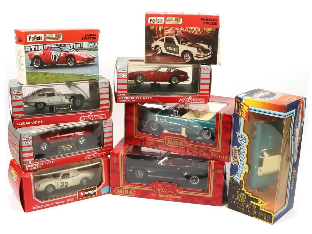 défférentes échelles - comprend les marques : MIRA, POLISTIL BBURAGO & MAJORETTE - on y retrouve notamment les modèles : JAGUAR TYPE E, MERCEDES 500 SL FERRARI 250 LM & PORCHE POLIZEI - boîtes légèrement encrassées
