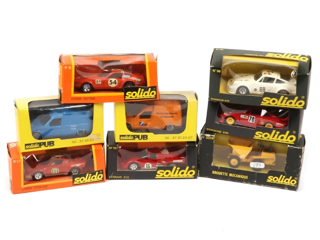 comprend les notamment les séries : GAM 1, GAM 2 & SOLIDO PUB - on y retrouve notamment les modèles : LANCIA "STRATOS", FERRARI 512, BROUETTE MECANIQUE, PORSCHE 935 & PORSCHE 934 - boîtes légèrement encrassées & déformées en états 'b' à c'