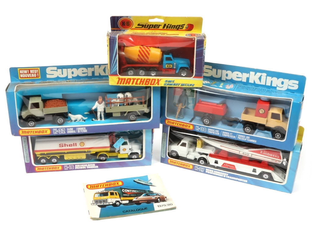 comprend notamment les modèles : K-30 UNIMOG ET COMPRESSEUR, K-32 UNIMOG DE FERME & K-16 ARTICULATED PETROL TANKER - on y joint un petit catalogue de la marque (1979-1980) - boîtes légèrement encrassées & déformées en états 'b' à c'