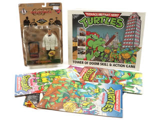 comprend : figurine JAMES BOND 'GOLDFINGER' (boite en état 'b' avec accrocs & déformation) - jeu de société 'TOWER OF DOOM TEENAGE MUTANT TURTLES' (boite en état 'd') manque le décor & 1 sabre - 3 livres de coloriage & coupures de magazine (avec accrocs & déchirures)