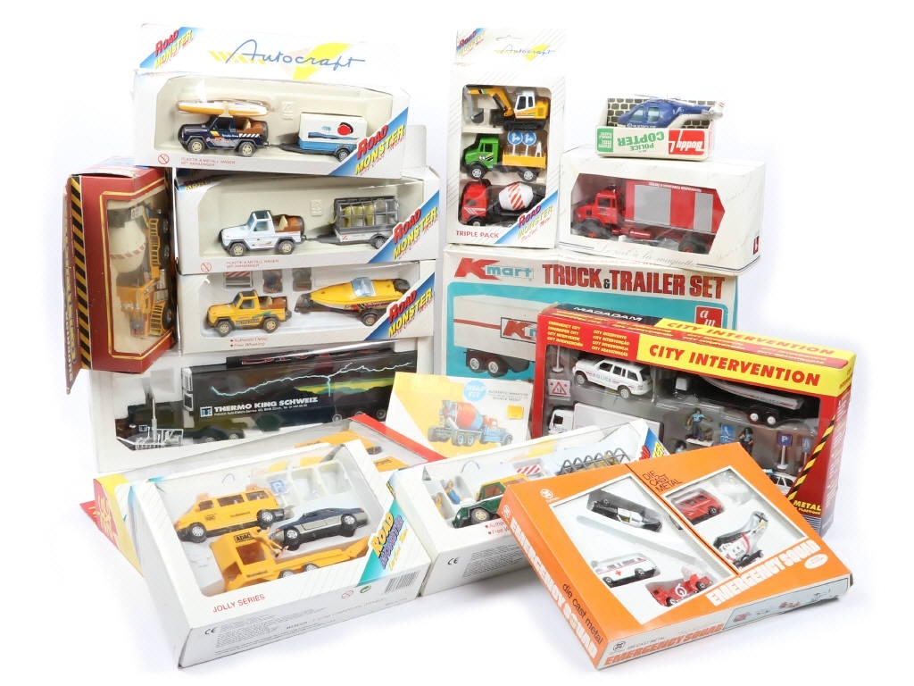 différentes échelles - comprend notamment les marques : LINDBERG, ZIG ZAG, AUTOCRAFT & AMT - on y retrouve notamment : véhicules & remorques, semi-remorques, figurines & 2 maquettes ( TRUCK & TRAILER SET 1/43ème & CEMENT MIXER, jamais ouverts) - boîtes légèrement encrassées & déformées en états 'b à c'