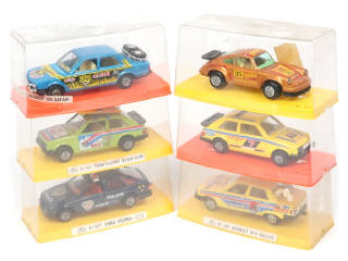 échelle 1/35ème - miniatures reproduisant les modèles : PEUGEOT, FORD (3 exemplaires), RENAULT & PORSCHE - boîtes plus ou moins encrassées (un exemplaire en état 'c' avec petits manques)