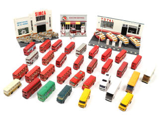 comprend notamment les marques : MATCHBOX, CORGI & LLEDO - on y retrouve notamment les modèles : SETRA COACH, AIRPORT COACH & LEYLAND TITAN - on y joint 3 DIORAMAS (SIMCA, TOTAL & STATION SERVICE) - possibilité de petits manques & parties cassées