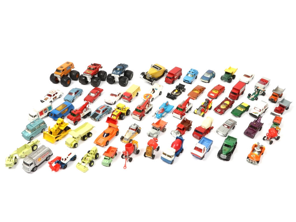 comprend notamment les marques : MATCHBOX, CORGI & HOT WHEELS - on y retrouve notamment les modèles : voitures de course, véhicules de chantiers, dépanneuses & monsters - possibilité de petits manques & parties cassées