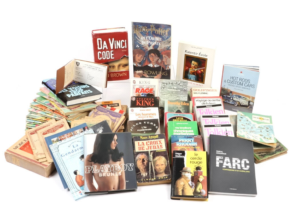 on y retrouve notamment les auteurs : JULES VERNE, STEPHEN KING, DAN BROWN & J.K. ROWLING - comprend notament les titres : HARRY POTTER ET L'ORDRE DU PHÉNIX, PLAYBOY BRUNES, HOT RODS & CUSTOM CARS, FARC, LES CLASSIQUES POUR TOUS & DES VOISINS TROP PARFAITS