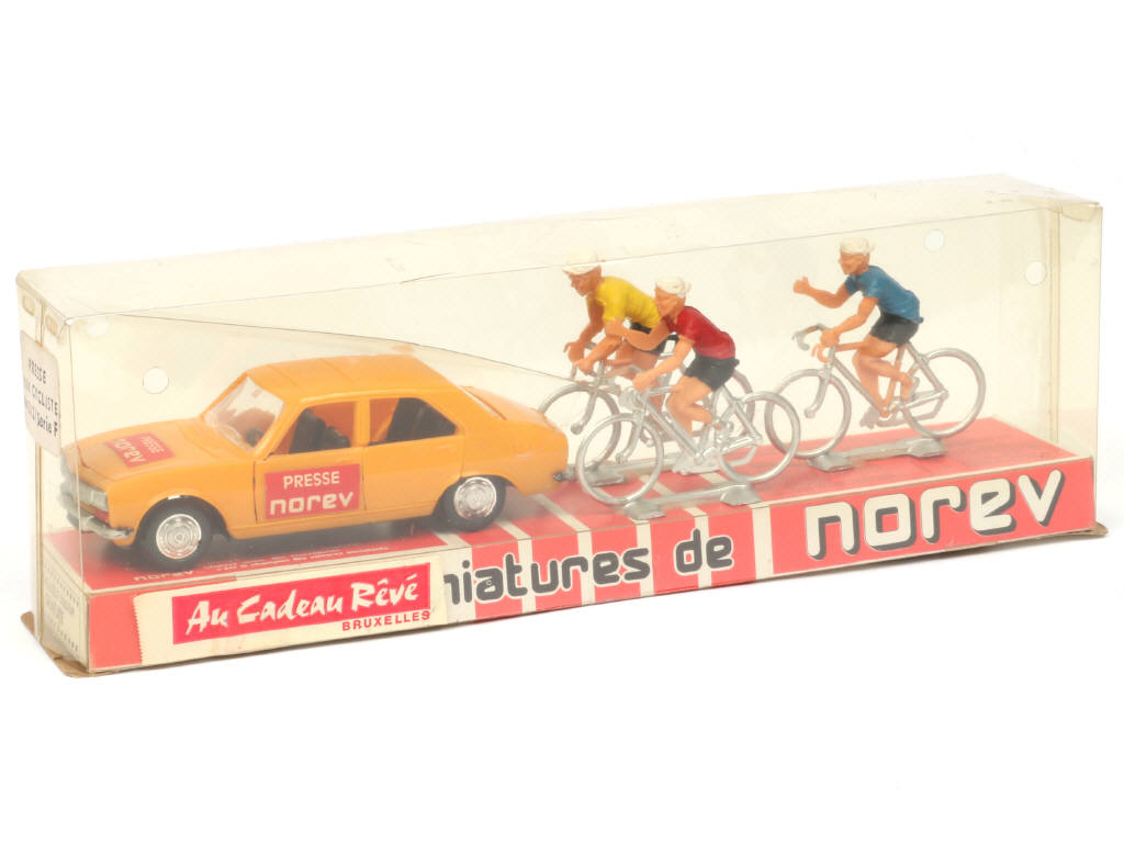 contient : PEUGEOT 504 'PRESSE NOREV' & 3 coureurs cyclistes (collés sur socle, avec cale, une étiquette de magasin collée sur le couvercle)
