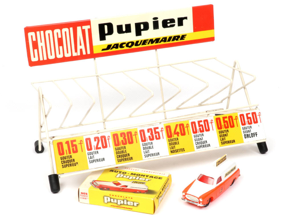 version à monter (un petit manque sur le décalque de toit) - on y joint un présentoir de gouters au chocolat de la célèbre marque PUPIER en état 'A-' (réalisation en métal & tôle, très légères traces d'oxydation par endroits)
