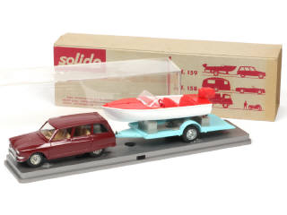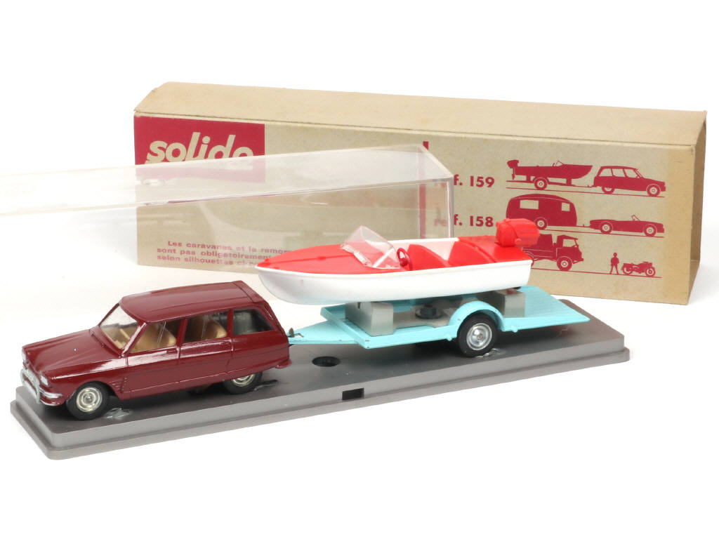 comprend : CITROËN AMI 6 break (crochet d'attelage déformé, pare-choc avant terni) & canot à moteur sur remorque (état 'A-' pour cette dernière) - 6 petites parties fondues sur le socle de boîte (étui cartonné présent, état 'a', très légèrement jauni)