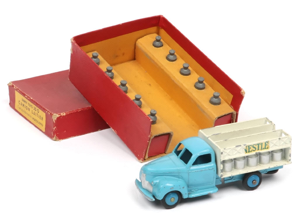 inscriptions 'NESTLE' en décalques - avec 10 bidons à lait & cales - modèle légèrement encrassé - éclats & peinture écaillée sur la caisse - boite avec quelques accrocs & frottements - pneus plus ou moins séchés