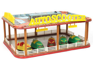 dimensions : 51,5 x 36 x 23 cm - moteurs à piles (non testé) - avec 5 auto-tamponneuses (non testées, quelques manques de peinture & petites parties de décalques) - manques certains accessoires (notamment les perches & les conducteurs des auto-tamponneuses) - piste légèrement ternie (autres parties chromées également) - 3 fixations de panonceaux cassées - boîte tachée & jaunie (non présentée sur la photo)