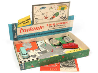 dimensions du coffret : 42x26 cm (destiné au marché italien) - contient : un autocar (moteur à clef à revoir), un coupé (moteur à clef fonctionne), 2 éléments de piste, 4 câbles ressorts, 2 clefs, 2 fils de guidage & notices - ensemble fixé par élastiques de maintien sur support cartonné illustré - coffret plus ou moins déchiré