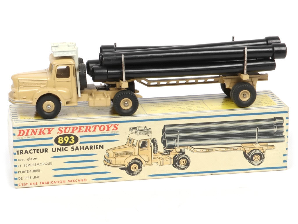 DINKY TOYS (FRANCE) 893 UNIC Saharien transport de pipe-lines (version avec jantes convexes & remorque ajourée) sable & blanc