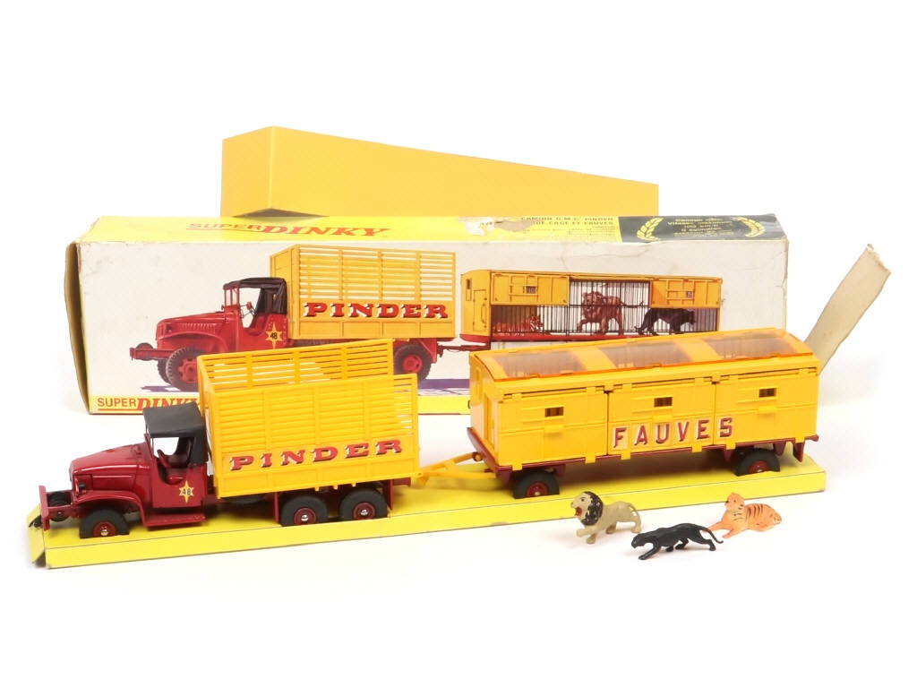 DINKY TOYS (FRANCE) 881 GMC 'PINDER' avec remorque-cage à fauves rouge & jaune