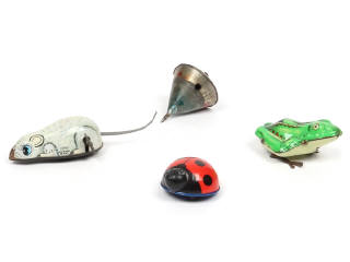fonctionnent - comprend : coccinelle 'LILI' (moteur à friction), grenouille (moteur à clef), souris (moteur à ressort) & toupie (incomplète) - on y retrouve notamment les marques : LEHMANN, YONEYA & VEB - quelques parties oxydées