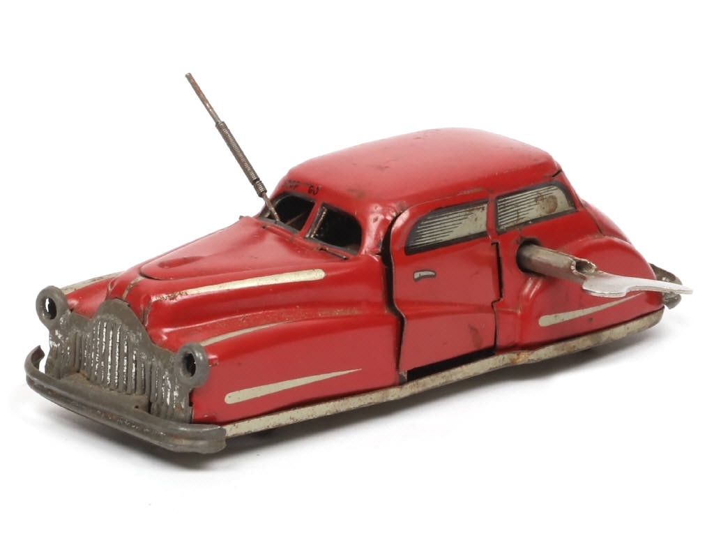 longueur : 13,5 cm - moteur à clef & mécanismes (fonctionnent, la portière ne se referme pas d'elle même, avec clef bloquée sur l'axe) - pare-chocs, roues, plancher, calandre & antenne plus ou moins ternis & oxydés
