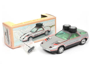 longueur 27 cm - moteur à friction (fonctionne) - avec cric sous sachet & 2 roues de secours amovibles - carrosserie légèrement encrassée - 2 manques de papier sur la boîte