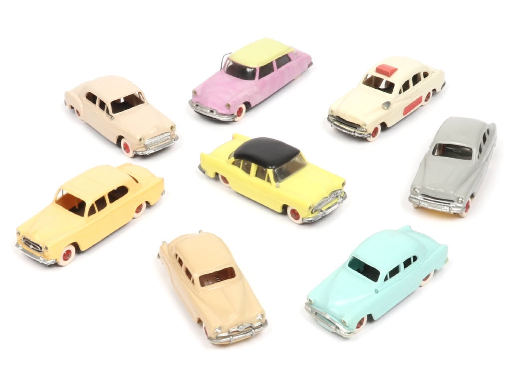 légères déformations des carrosseries - miniatures reproduisant les modèles : CITROËN (couleur rose marbré), SIMCA (3 exemplaires dont un avec plancher doré & phares scintillants), FORD (2 exemplaires dont un avec plancher doré & phares scintillants), RENAULT & PEUGEOT - avec manques & parties cassées (plus ou moins importants suivant les modèles)