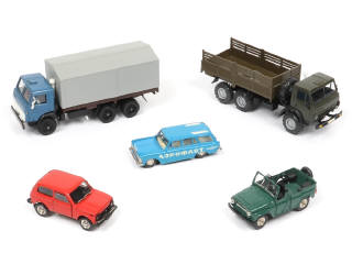 comprend les modèles : KAMAZ, LADA (un rétroviseur à recoller), UAZ & MOSKVITCH (plancher cassé à recoller) - quelques accessoires manquants
