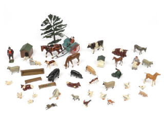 comprend notamment : personnages, niche, animaux de la ferme & charrette - quelques manques, parties cassées & possibilité de parties repeintes - on y retrouve les marques : BRITAINS & JOHILLCO