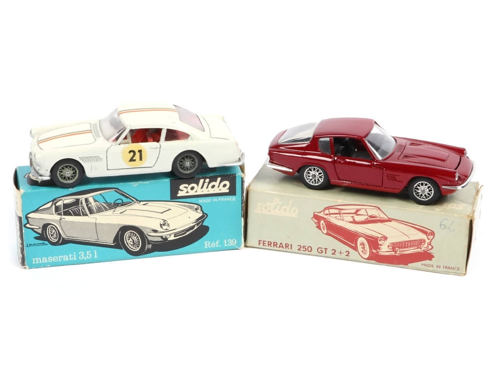 comprend les modèles : MASERATI 3,5L (décalques apposés) & FERRARI 250 GT 2+2 - pneus séchés - boîtes légèrement déformées & ternies en états 'b' & 'd'