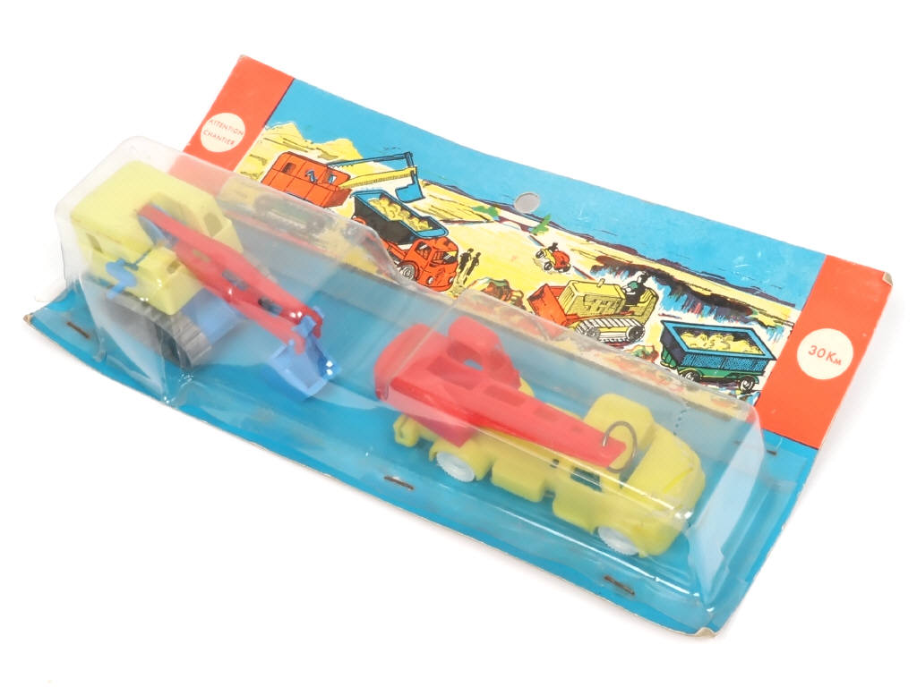 réalisation en plastique souple - longueur de l'ensemble : 26 cm - contient : un camion-grue & une excavatrice - blister déchiré