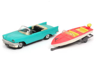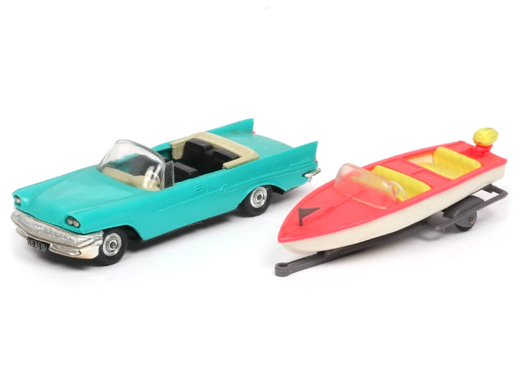 NOREV (FRANCE) 92 CHRYSLER NEW YORKER avec hors-bord ROCCA sur remorque vert, blanc & orange fluo