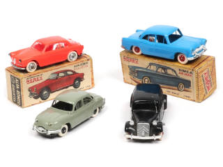 comprend : SIMCA ARIANE (en boîte état 'd'), ALFA ROMEO GIULIETTA (avec pneus blancs, en boîte état 'b' avec quelques accrocs), CITROËN 15 SIX & PANHARD DYNA (version avec moteur à friction fonctionne, un rivet & antenne cassés & manquants) - carrosseries plus ou moins déformées