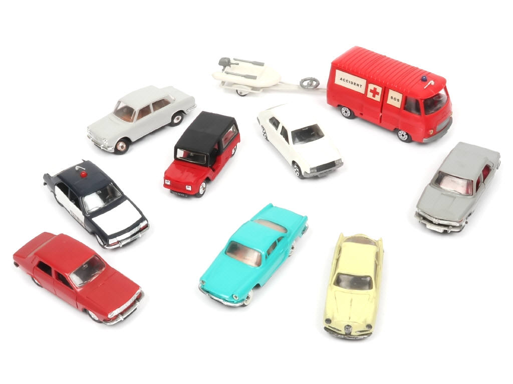 miniatures reproduisant les modèles : PEUGEOT (un exemplaire avec antenne cassée), SIMCA, BMW, RENAULT, CITROËN (manque volant & roue de secours) & ALFA ROMEO (carrosserie encrassée) - quelques petites déformations plus ou moins importantes sur certaines carrosseries - certaines jantes plus ou moins fondues
