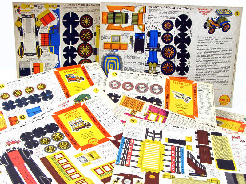 collection 'BOLIDES D'AUTREFOIS' - comprend les marques : MARCUS, RENAULT, PANHARD & LEVASSOR, SERPOLLET, DELAHAYE, CADILLAC, FORD, ROLLS ROYCE, FIAT, JEANTAUD & omnibus parisien - une planche avec un élément détaché - ces montages étaient offerts dans les stations-services SHELL dans les années 60