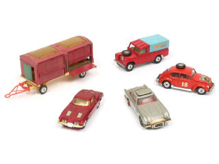 miniatures reproduisant les modèles : LAND ROVER (petites traces d'oxydation sur la bâche), VOLKSWAGEN (direction fonctionne, pneus craquelés, manque un autocollant & un autre endommagé), ASTON MARTIN James Bond (manque un pneu, un mécanisme à revoir, sans accessoire), CHEVROLET CORVETTE (manque de pellicule chromée sur le pare-choc avant) & remorque-cage 'CHIPPERFIELDS' (avec 2 ours & un lion) - ensemble plus ou moins encrassé - pneus en grande partie séchés