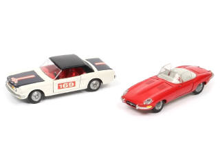 comprend : JAGUAR TYPE E cabriolet (avec roue de secours) & FORD MUSTANG (avec accessoires dans le coffre, décalques apposés) - quelques parties ternies - pneus plus ou moins séchés