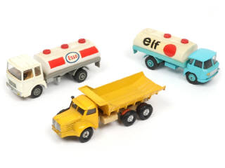 comprend : BERLIET benne carrière (chassis & certains pneus non conformes, remplacés, petites traces de peinture sur ces derniers), SAVIEM SM300 (jantes légèrement fondues) & WILLEME citerne 'ELF' (quelques manques & éléments cassés)