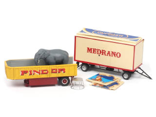 comprend : transport de barrières 'PINDER' (quelques petits manques sur les décalques) & caisse 'CIRQUE MEDRANO' - on y joint un éléphant & son accessoire - quelques petits manques & parties cassées à recoller - on y retrouve les marques : MINITRUCKS & DUTHY 43