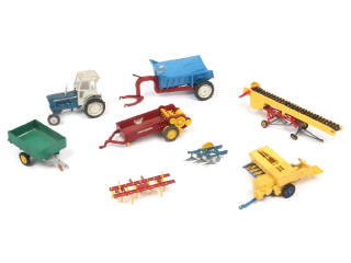 fabrications en plastique & métal - comprend notamment : tracteur FORD, presse BAMFORDS & MULTI-LEVEL élévateur - quelques petits manques & parties fondues - modèles plus ou moins encrassés