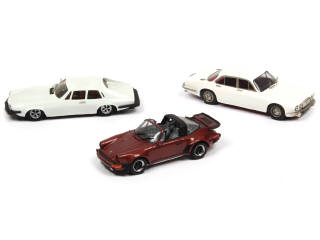 comprend : JAGUAR XJ-S 1975PORSCHE TURBO TARGA (série limitée numérotée 4/79 exemplaires - aménagement intérieur avec traces d'humidité) & DAIMLER DOUBLE SIX (série limitée numérotée 68/300 exemplaires) - on y retrouve les marques : MRF, AMR & GRAND PRIX MODELS
