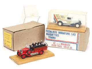 série limitée sur base SOLIDO présentés sur socles en bois - comprend : transport de troupe (numéroté 382 sous le socle) & fourgonnette 'KIT JOUETS' (numéroté 42 sous le socle) - avec suremballages