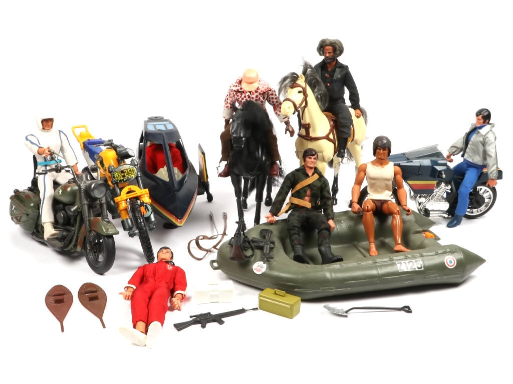 comprend : 3 motos (incomplètes), SPACE SPY VEHICLE réf : 4191 (incomplet, certains autocollants se décollent, un mécanisme d'aile cassé), 2 chevaux (2 pattes recollées sur un cheval), un bateau ACTION JOE, 8 BIG JIM & un lot d'accessoires