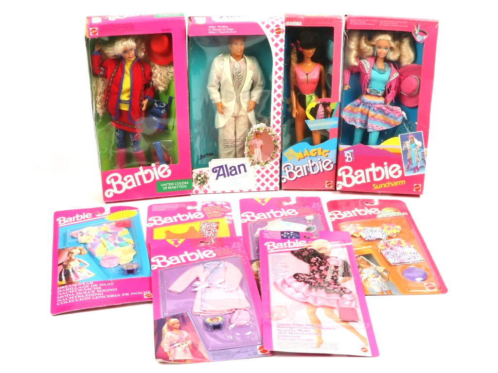 comprend : BARBIE SUNCHARM réf : 9932, BARBIE SUN MAGIC réf : 3244, ALAN MARIÉ réf : 9607, BARBIE BENETTON réf : 9404 & 6 tenues - les boites sont scellées, états 'b' à 'c' avec accrocs, déformations dont 3 avec un trou dans le cartonnage